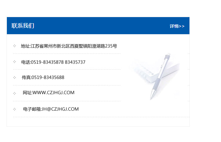 地址:常州市新北區友邦商務大廈1幢16、17層  電話:0519-85101652  傳真:0519-85112595  郵編:213022  網址:www_cz-jiayue_cn.fyxcgjg.com  郵箱:xiajifengaa@163.com